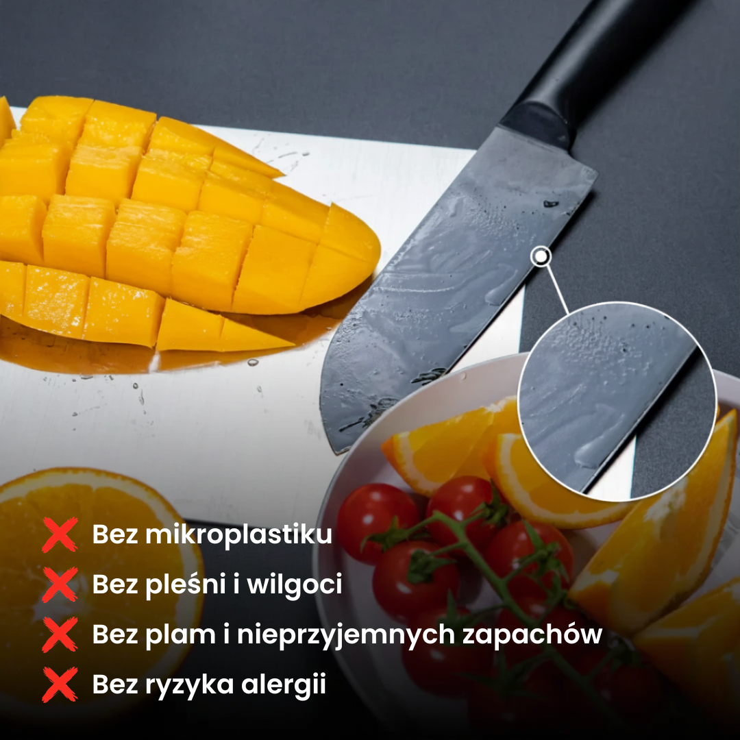 Tytanova to nowoczesna deska do krojenia stworzona dla osób, które mają dość plastikowych rowków i drewnianych desek chłonących wilgoć oraz zapachy. Gładka, nieporowata powierzchnia sprawia, że po krojeniu wystarczy szybkie spłukanie — bez szorowania i bez „zapachu cebuli” na kolejnym posiłku.